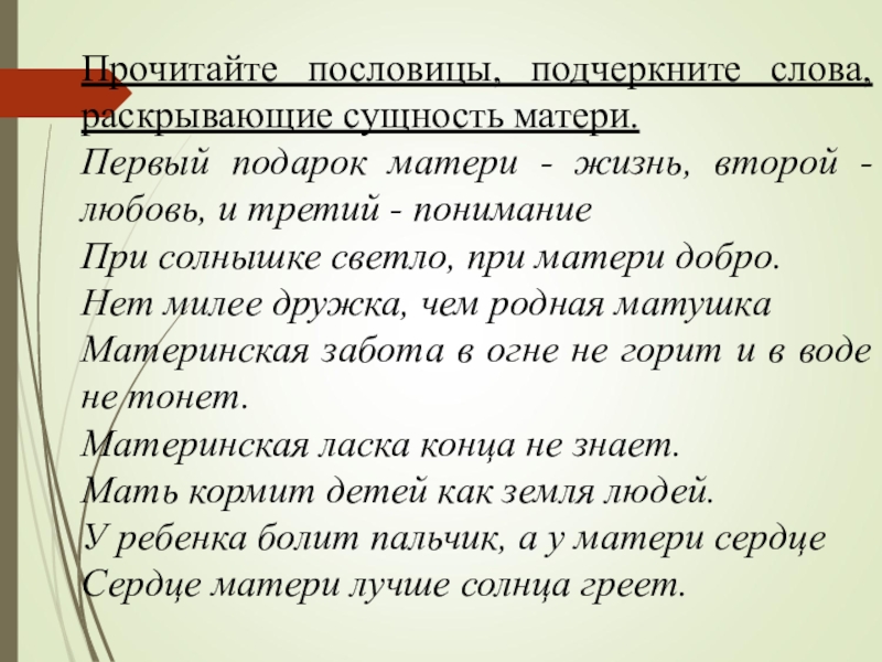 Прочитайте пословицы, подчеркните слова, раскрывающие сущность матери.Первый подарок матери - жизнь, второй - любовь, и третий -