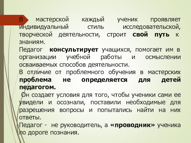Слайд 3В мастерской каждый ученик проявляет индивидуальный стиль исследовательской, творческой деятельности, строит