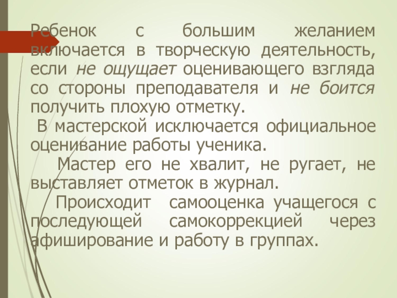 В мастерской исключается официальное оценивание работы ученика.
