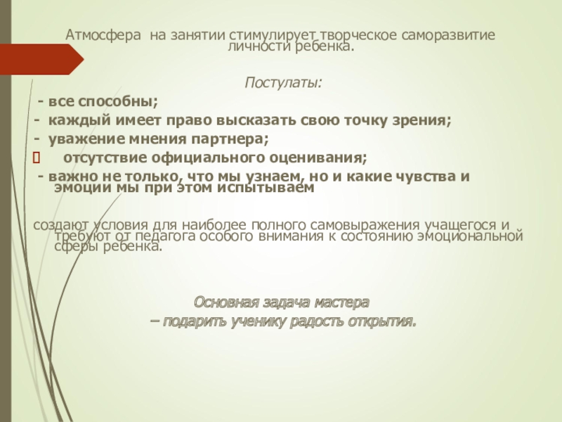 Атмосфера на занятии стимулирует творческое саморазвитие личности ребенка. Постулаты: - все способны; - каждый имеет право высказать