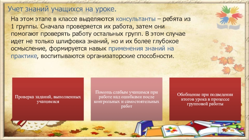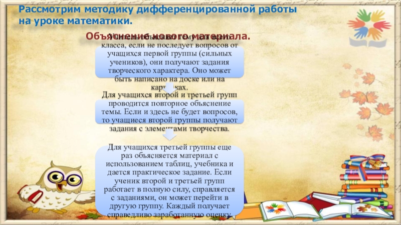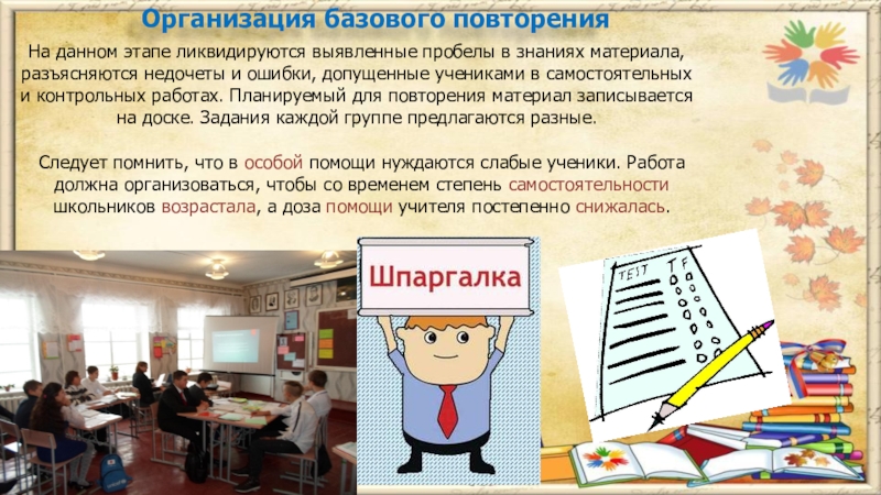 Следует помнить, что в особой помощи нуждаются слабые ученики. Работа должна организоваться, чтобы со временем степень самостоятельности школьников возрастала, а доза помощи учителя постепенно снижалась.