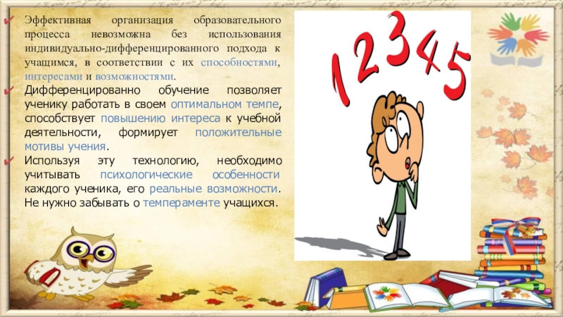 Реализация дифференцированного подхода к обучению математики требует от учителя знания возможностей учащихся, регулирования учебной нагрузки, тщательного подбора дидактического материала, оснащение кабинета справочной и научно-популярной литературой. Это способствует повышению интереса учащихся к учебной деятельности, формирует положительную мотивацию учения, от чего главным образом зависит результат обучения.