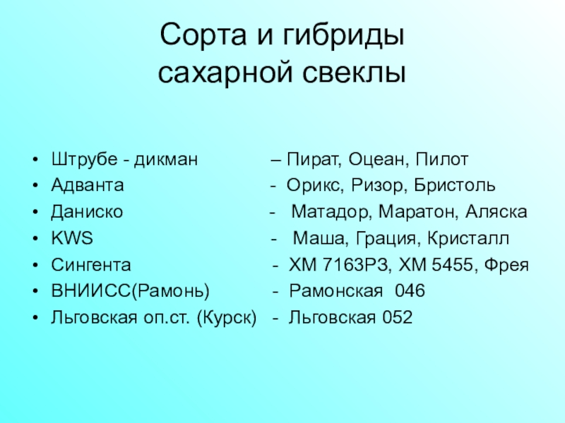 Сорта и гибриды  сахарной свеклыШтрубе - дикман       – Пират, Оцеан,