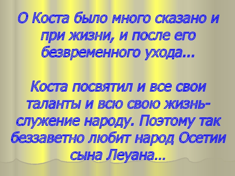 безвременного ухода... Коста посвятил и все свои таланты и всю свою жизнь- служение народу. Поэтому так беззаветно любит народ Осетии сына Леуана…