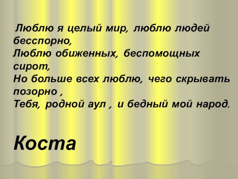 сирот, Но больше всех люблю, чего скрывать позорно , Тебя, родной аул , и бедный мой народ. Коста