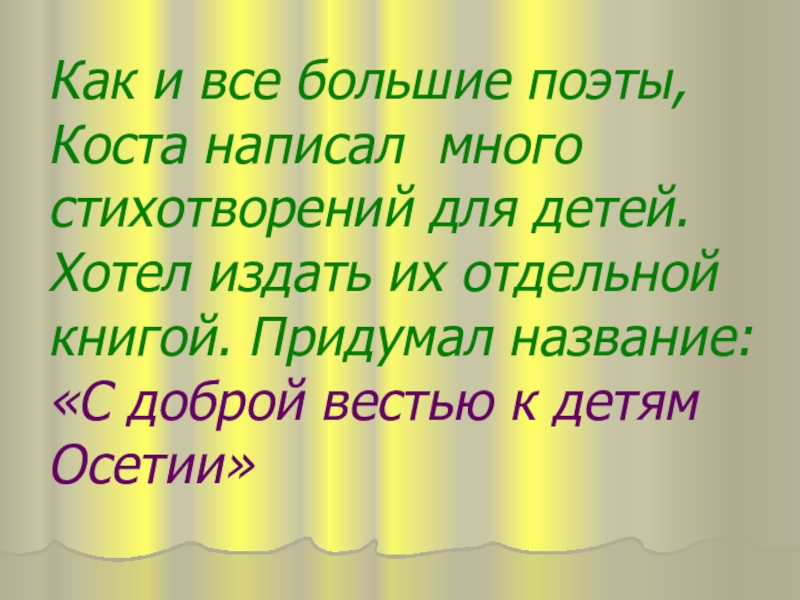 Слайд 13Как и все большие поэты, Коста написал много стихотворений для детей.