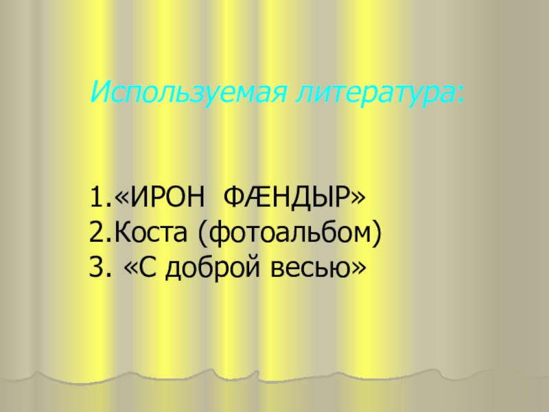 Слайд 23 Используемая литература: 1.«ИРОН ФÆНДЫР» 2.Коста (фотоальбом) 3. «С доброй весью»