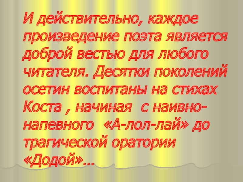 Десятки поколений осетин воспитаны на стихах Коста , начиная с наивно-напевного «А-лол-лай» до трагической оратории «Додой»…