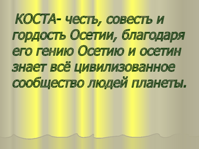 Слайд 3 КОСТА- честь, совесть и гордость Осетии, благодаря его гению Осетию