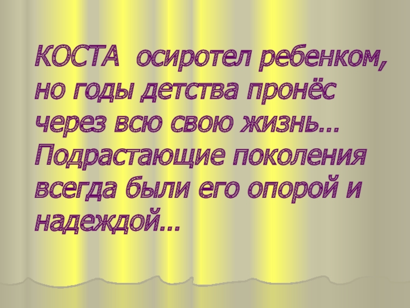 Слайд 11КОСТА осиротел ребенком, но годы детства пронёс через всю свою жизнь…