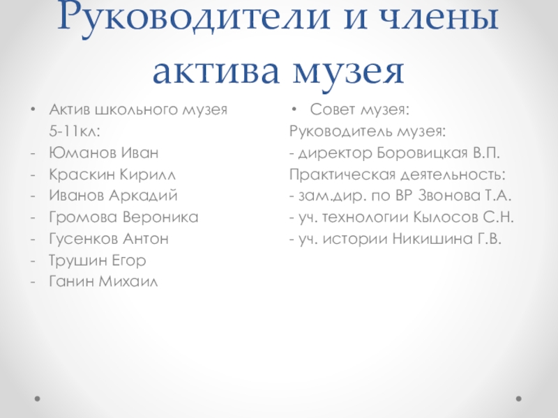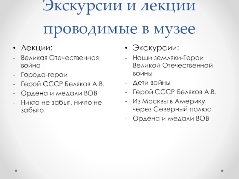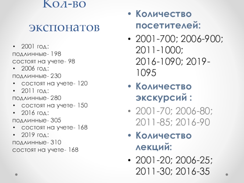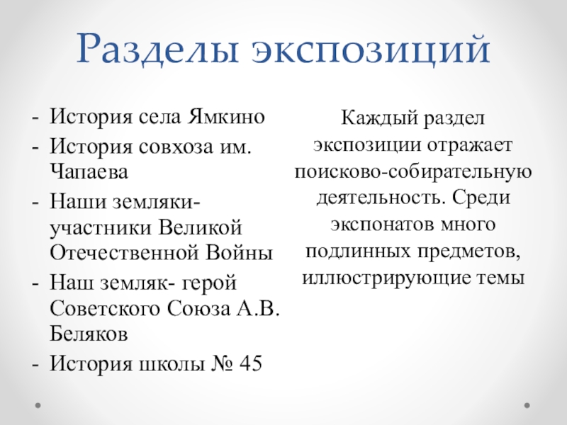 Каждый раздел экспозиции отражает поисково-собирательную деятельность. Среди экспонатов много подлинных предметов, иллюстрирующие темы