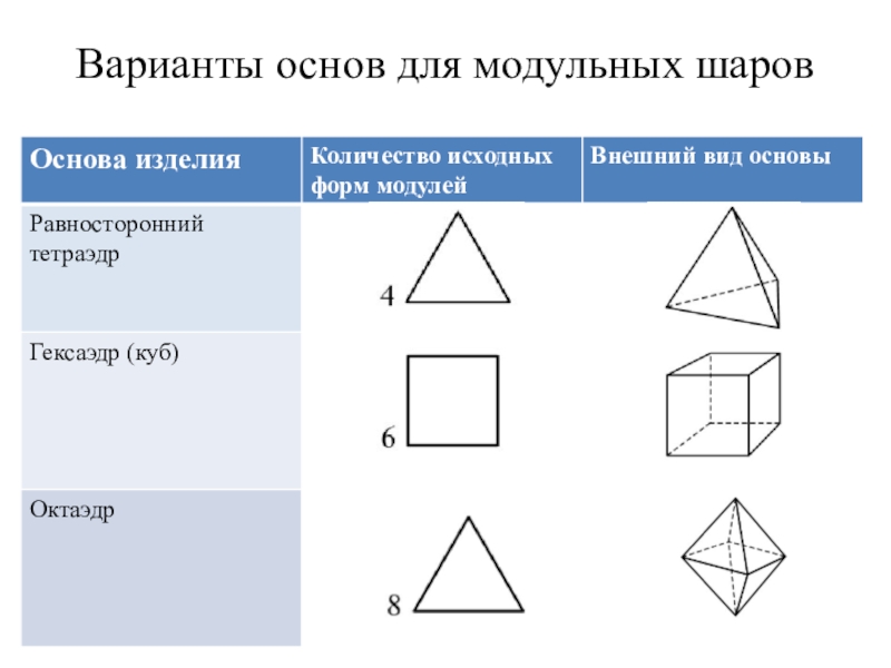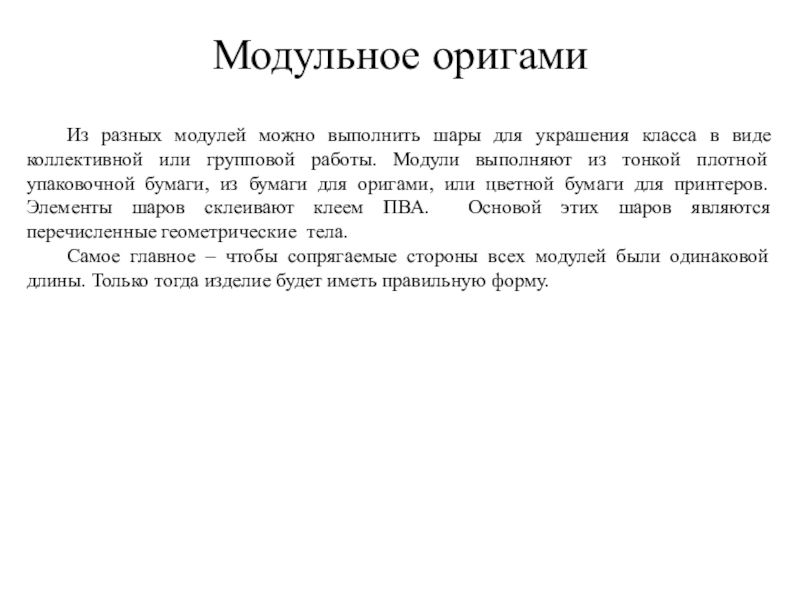 виде коллективной или групповой работы. Модули выполняют из тонкой плотной упаковочной бумаги, из бумаги для оригами, или цветной бумаги для принтеров. Элементы шаров склеивают клеем ПВА. Основой этих шаров являются перечисленные геометрические тела.