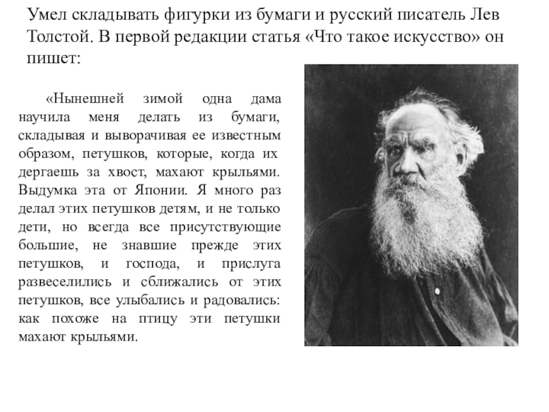 Слайд 3Умел складывать фигурки из бумаги и русский писатель Лев Толстой. В