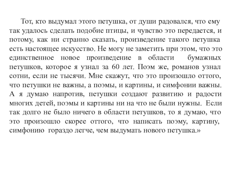 удалось сделать подобие птицы, и чувство это передается, и потому, как ни странно сказать, произведение такого петушка есть настоящее искусство. Не могу не заметить при этом, что это единственное новое произведение в области бумажных петушков, которое я узнал за 60 лет. Поэм же, романов узнал сотни, если не тысячи. Мне скажут, что это произошло оттого, что петушки не важны, а поэмы, и картины, и симфонии важны. А я думаю напротив, петушки создают развитию и радости многих детей, поэмы и картины ни на что не были нужны. Если так долго не было ничего в области петушков, то я думаю, что это произошло скорее оттого, что написать поэму, картину, симфонию гораздо легче, чем выдумать нового петушка.»