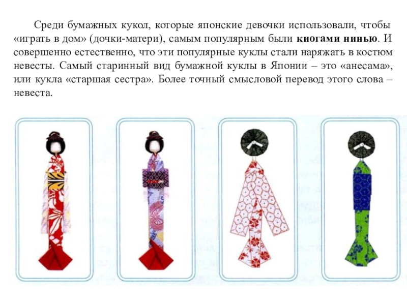 (дочки-матери), самым популярным были киогами нинью. И совершенно естественно, что эти популярные куклы стали наряжать в костюм невесты. Самый старинный вид бумажной куклы в Японии – это «анесама», или кукла «старшая сестра». Более точный смысловой перевод этого слова – невеста.