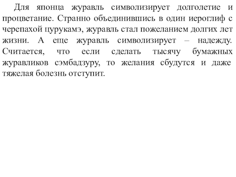 Слайд 23 Для японца журавль символизирует долголетие и процветание. Странно объединившись в один