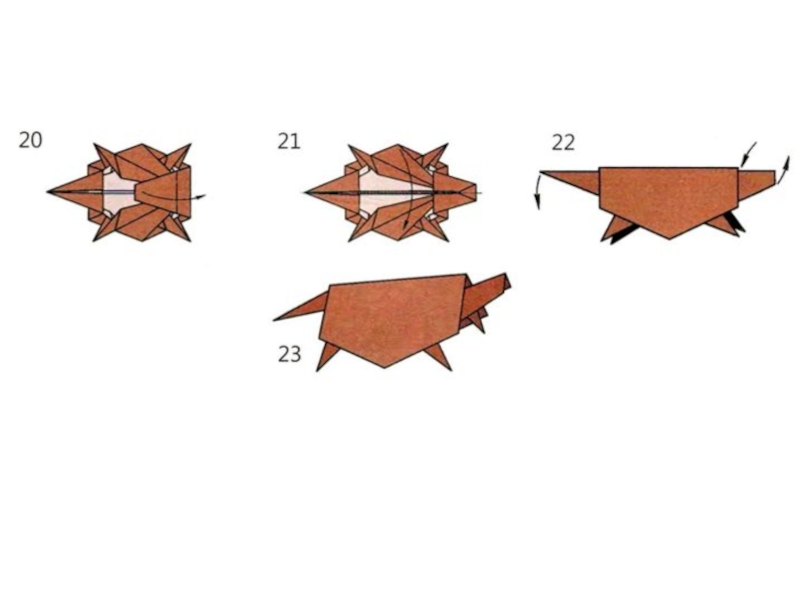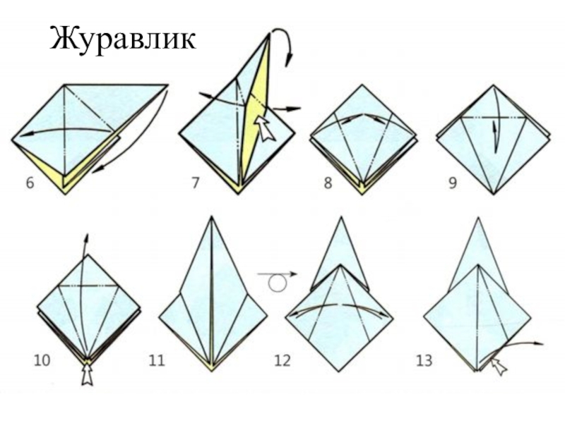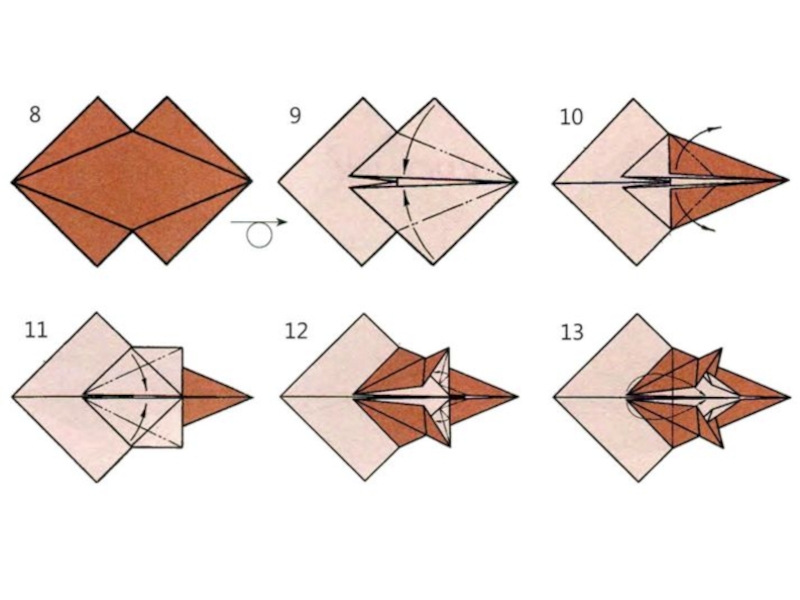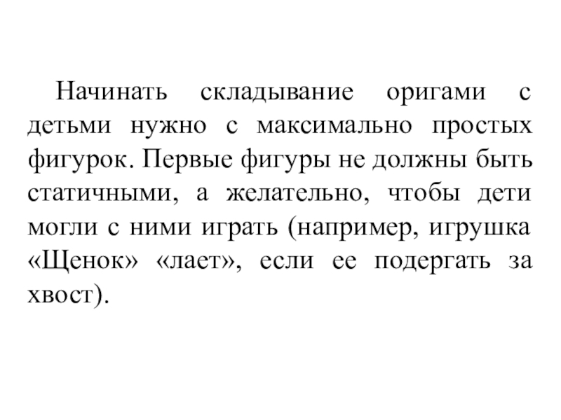 Слайд 12 Начинать складывание оригами с детьми нужно с максимально простых фигурок. Первые
