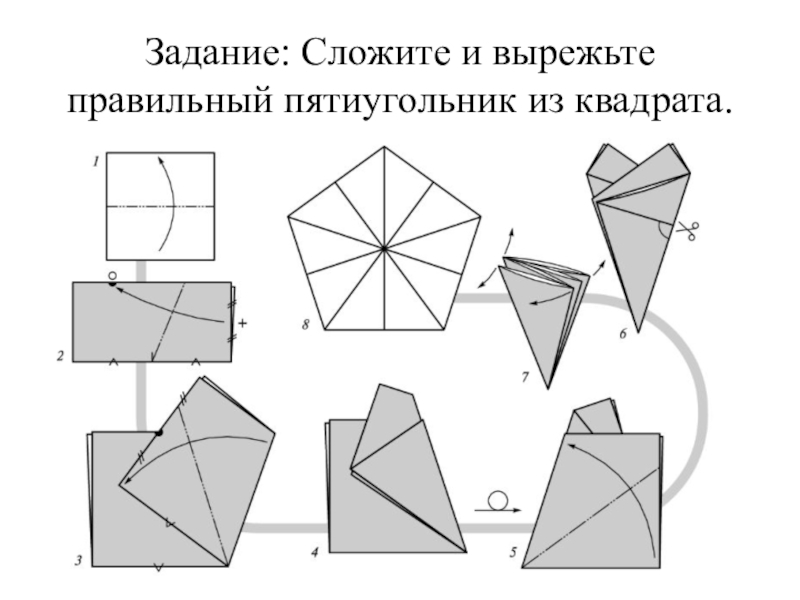 Слайд 19Задание: Сложите и вырежьте правильный пятиугольник из квадрата.