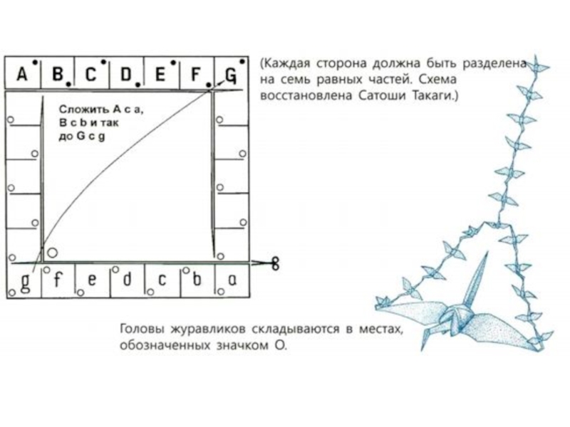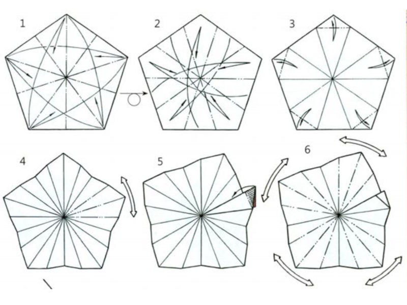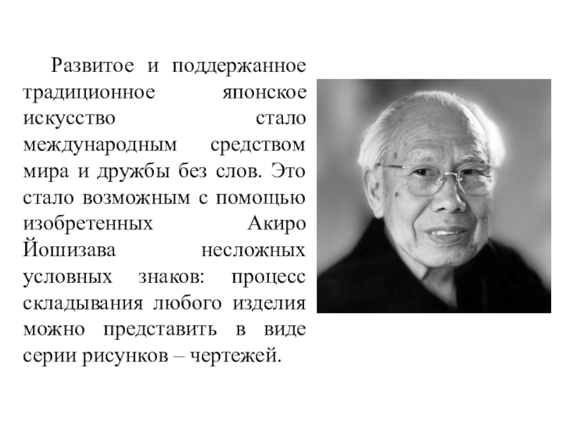 дружбы без слов. Это стало возможным с помощью изобретенных Акиро Йошизава несложных условных знаков: процесс складывания любого изделия можно представить в виде серии рисунков – чертежей.