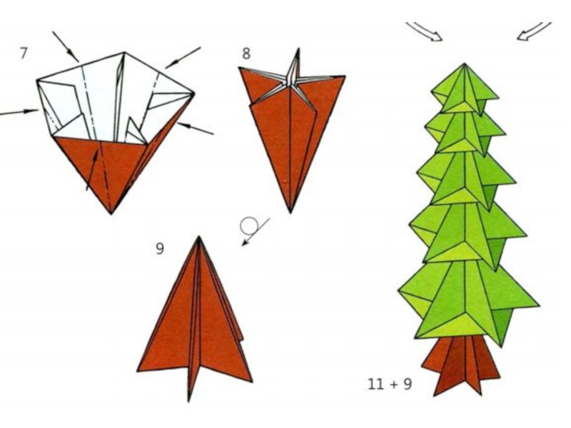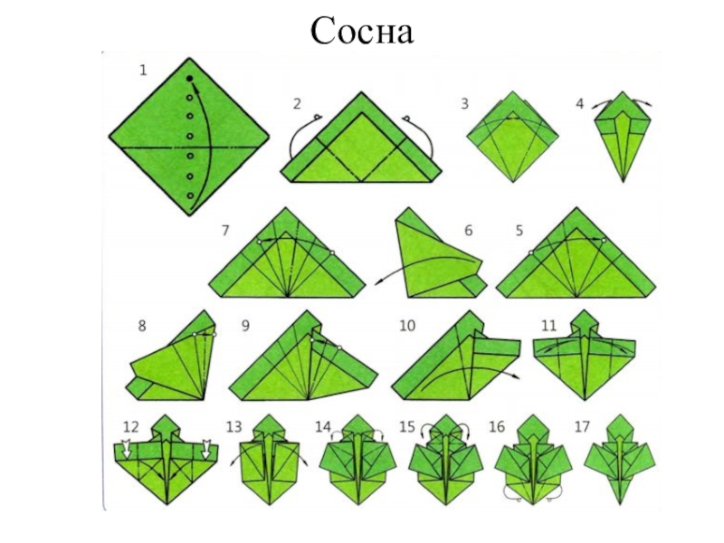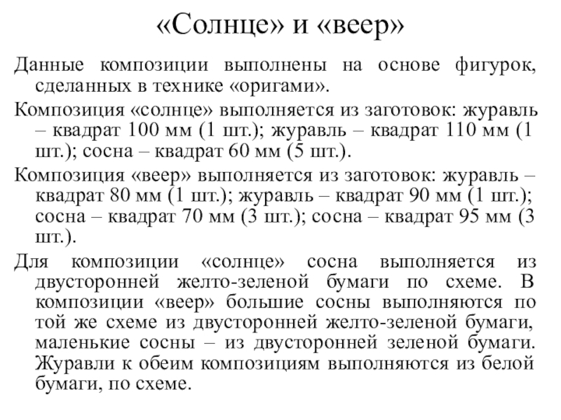 Для композиции «солнце» сосна выполняется из двусторонней желто-зеленой бумаги по схеме. В композиции «веер» большие сосны выполняются по той же схеме из двусторонней желто-зеленой бумаги, маленькие сосны – из двусторонней зеленой бумаги. Журавли к обеим композициям выполняются из белой бумаги, по схеме.