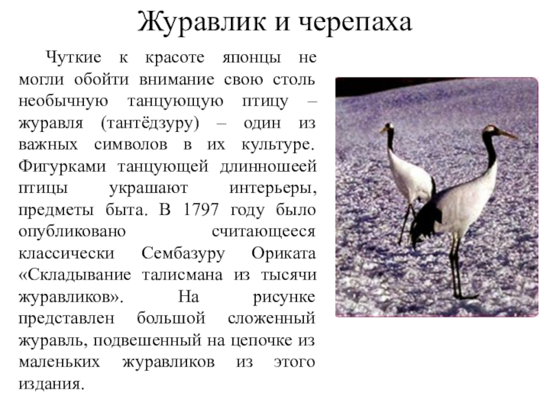 свою столь необычную танцующую птицу – журавля (тантёдзуру) – один из важных символов в их культуре. Фигурками танцующей длинношеей птицы украшают интерьеры, предметы быта. В 1797 году было опубликовано считающееся классически Сембазуру Ориката «Складывание талисмана из тысячи журавликов». На рисунке представлен большой сложенный журавль, подвешенный на цепочке из маленьких журавликов из этого издания.