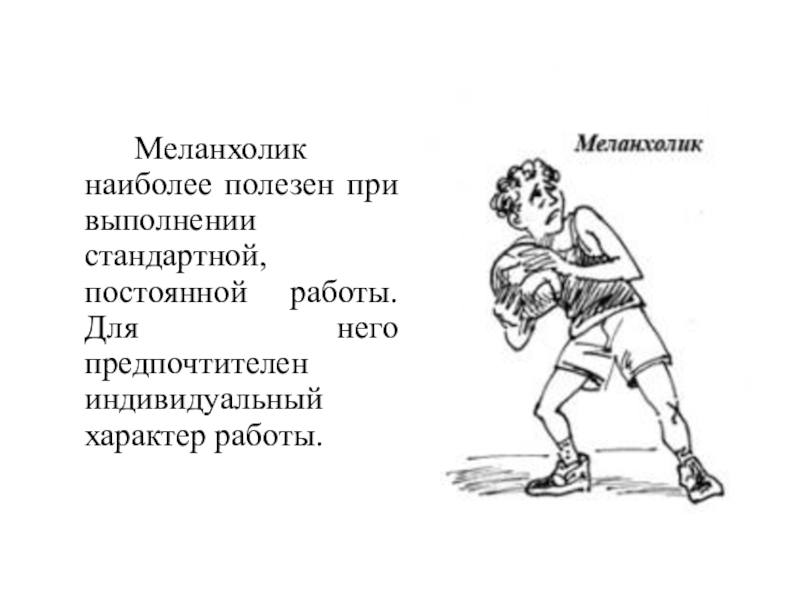 Слайд 13 Меланхолик наиболее полезен при выполнении стандартной, постоянной работы. Для него предпочтителен