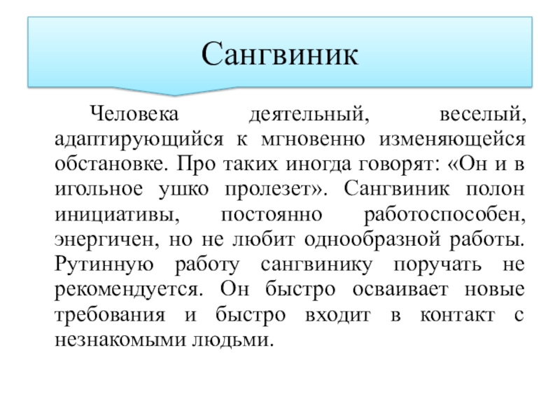 говорят: «Он и в игольное ушко пролезет». Сангвиник полон инициативы, постоянно работоспособен, энергичен, но не любит однообразной работы. Рутинную работу сангвинику поручать не рекомендуется. Он быстро осваивает новые требования и быстро входит в контакт с незнакомыми людьми.