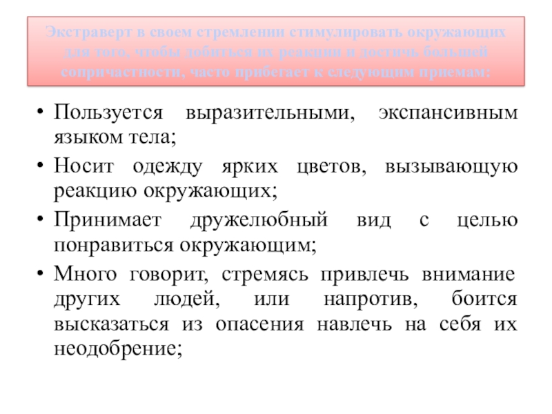 Слайд 3Экстраверт в своем стремлении стимулировать окружающих для того, чтобы добиться их