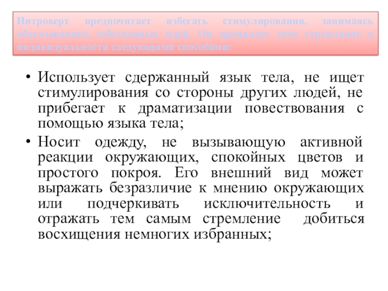 Слайд 5Интроверт предпочитает избегать стимулирования, занимаясь обдумыванием собственных идей. Он проявляет свое