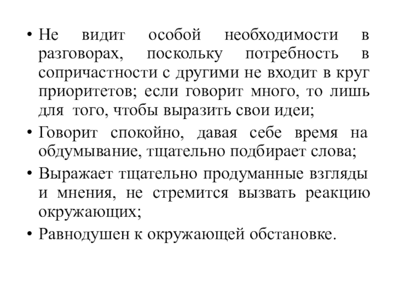 другими не входит в круг приоритетов; если говорит много, то лишь для того, чтобы выразить свои идеи;