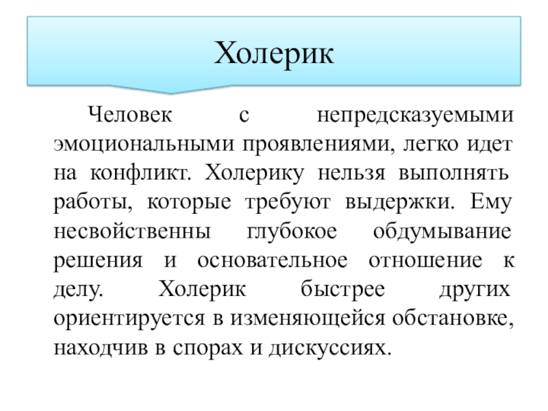Человек с непредсказуемыми эмоциональными проявлениями, легко идет на конфликт. Холерику нельзя