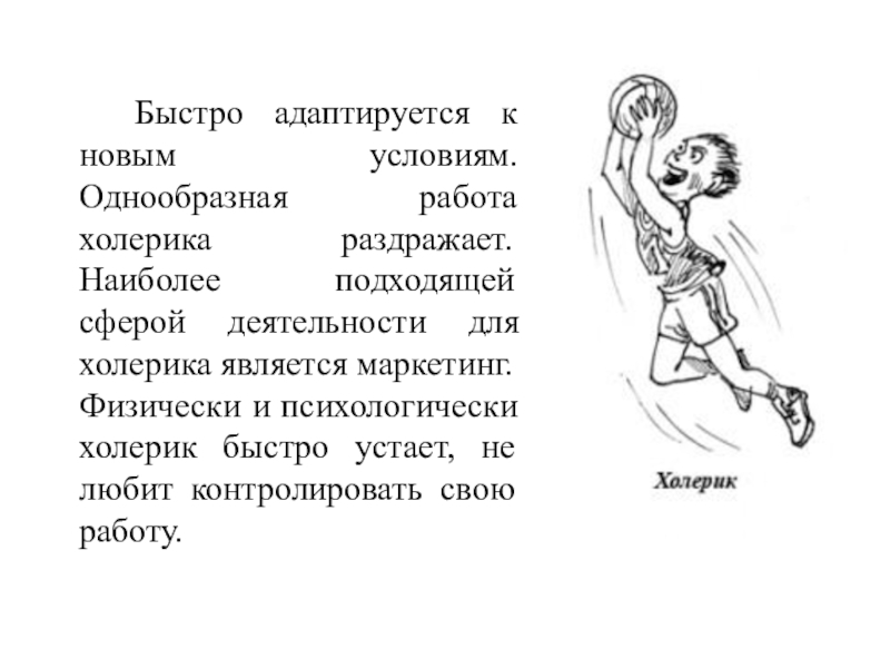 Слайд 11 Быстро адаптируется к новым условиям. Однообразная работа холерика раздражает. Наиболее подходящей