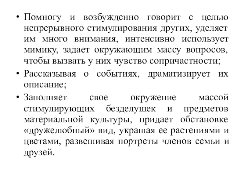 Слайд 4Помногу и возбужденно говорит с целью непрерывного стимулирования других, уделяет им