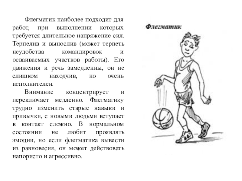 Слайд 15 Флегматик наиболее подходит для работ, при выполнении которых требуется длительное напряжение
