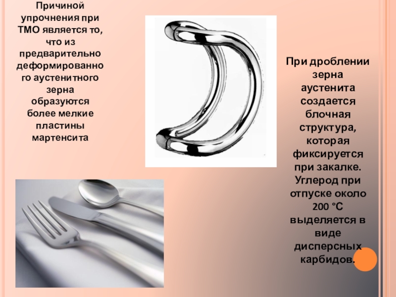 Причиной упрочнения при ТМО является то, что из предварительно деформированного аустенитного зерна образуются более мелкие пластины мартенсита