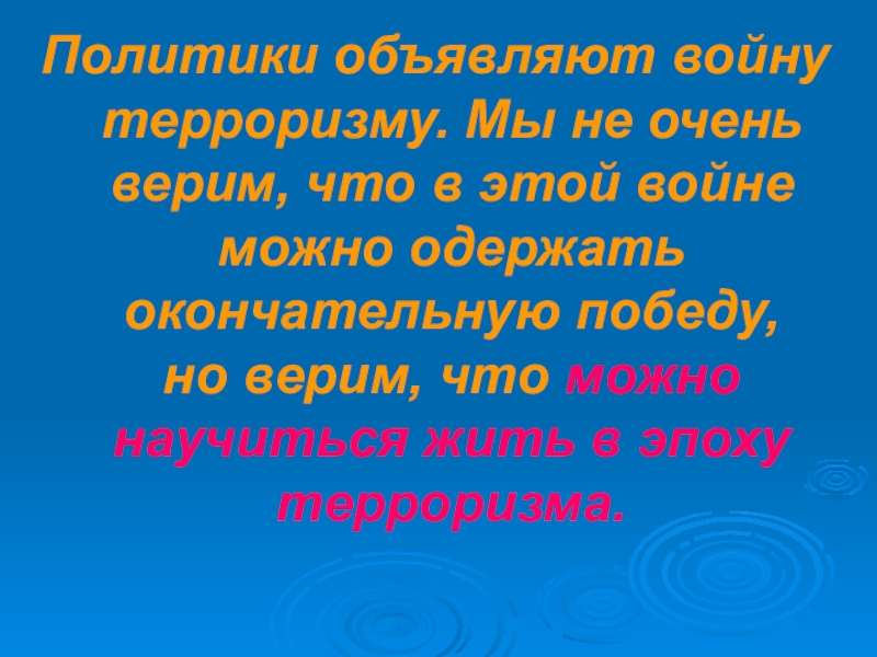 Слайд 24Политики объявляют войну терроризму. Мы не очень верим, что в этой войне можно одержать