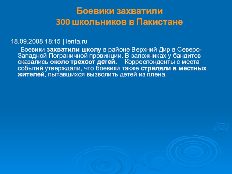 в районе Верхний Дир в Северо-Западной Пограничной провинции. В заложниках у бандитов оказались около трехсот детей. Корреспонденты с места событий утверждали, что боевики также стреляли в местных жителей, пытавшихся вызволить детей из плена.