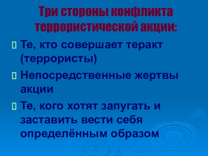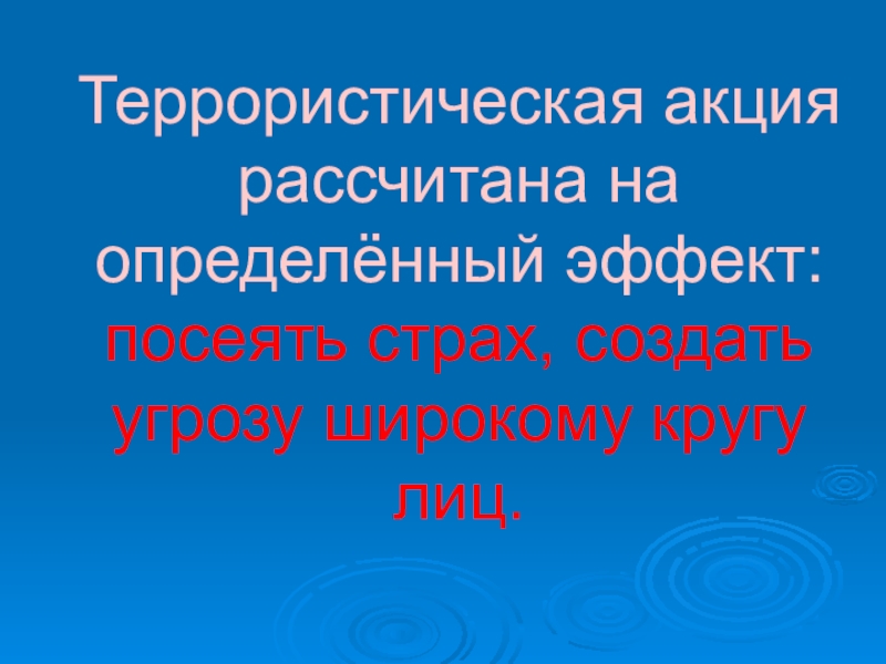 Слайд 6Террористическая акция рассчитана на определённый эффект: посеять страх, создать угрозу широкому