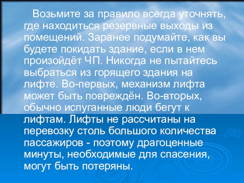 выходы из помещений. Заранее подумайте, как вы будете покидать здание, если в нем произойдёт ЧП. Никогда не пытайтесь выбраться из горящего здания на лифте. Во-первых, механизм лифта может быть повреждён. Во-вторых, обычно испуганные люди бегут к лифтам. Лифты не рассчитаны на перевозку столь большого количества пассажиров - поэтому драгоценные минуты, необходимые для спасения, могут быть потеряны.