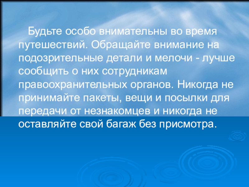 путешествий. Обращайте внимание на подозрительные детали и мелочи - лучше сообщить о них сотрудникам правоохранительных органов. Никогда не принимайте пакеты, вещи и посылки для передачи от незнакомцев и никогда не оставляйте свой багаж без присмотра.