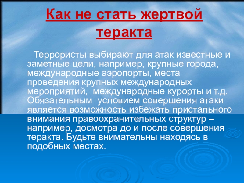 выбирают для атак известные и заметные цели, например, крупные города, международные аэропорты, места проведения крупных международных мероприятий, международные курорты и т.д. Обязательным условием совершения атаки является возможность избежать пристального внимания правоохранительных структур – например, досмотра до и после совершения теракта. Будьте внимательны находясь в подобных местах.