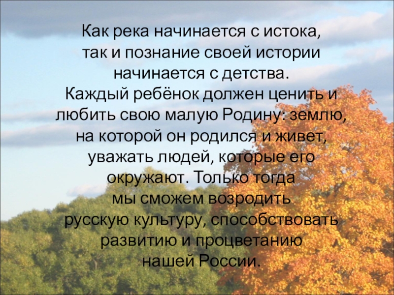 ребёнок должен ценить и любить свою малую Родину: землю, на которой он родился и живет, уважать людей, которые его окружают. Только тогда мы сможем возродить русскую культуру, способствовать развитию и процветанию нашей России.