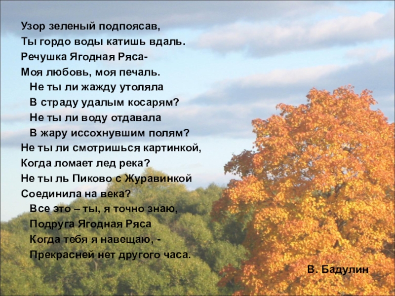Узор зеленый подпоясав,Ты гордо воды катишь вдаль.Речушка Ягодная Ряса-Моя любовь, моя печаль.  Не ты ли жажду