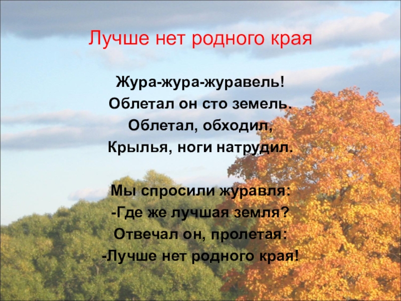 Лучше нет родного краяЖура-жура-журавель!Облетал он сто земель.Облетал, обходил,Крылья, ноги натрудил.Мы спросили журавля:-Где же лучшая земля?Отвечал он, пролетая:-Лучше