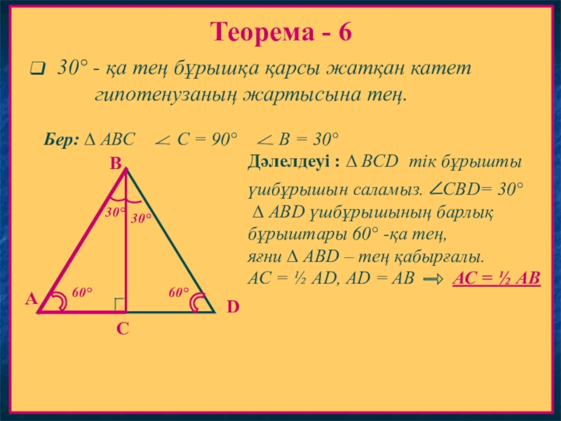 Дәлелдеуі : ∆ ВСD тік бұрышты үшбұрышын саламыз. СВD= 30°