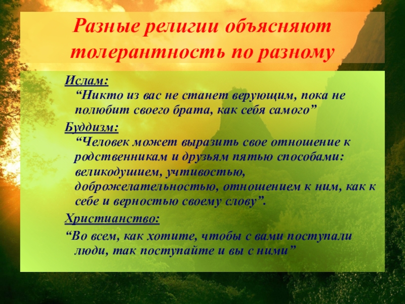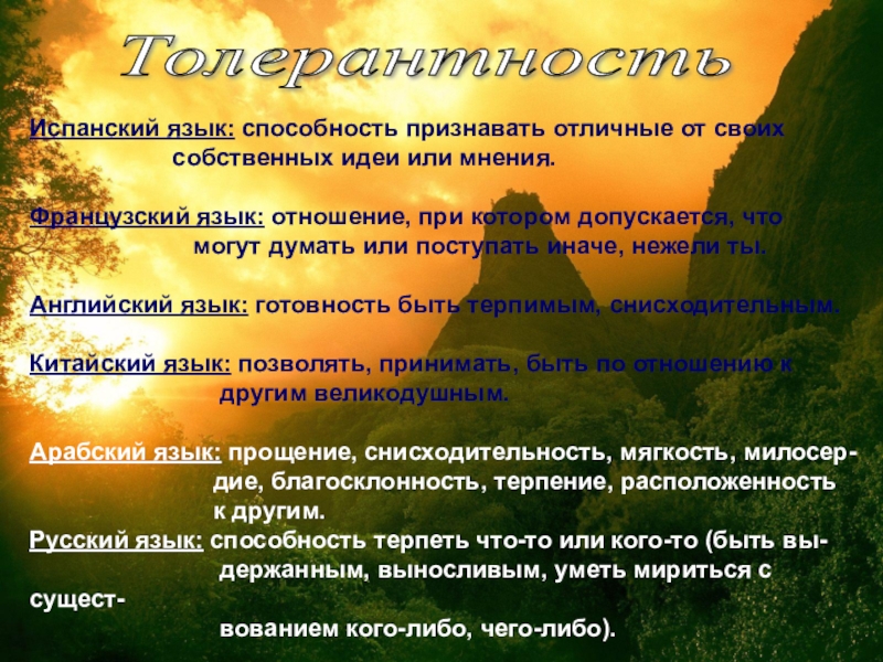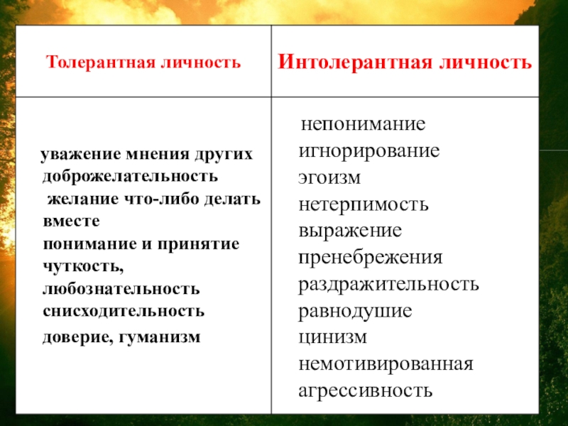 Толерантность считается признаком высокого духовного и интеллектуального развития личности.