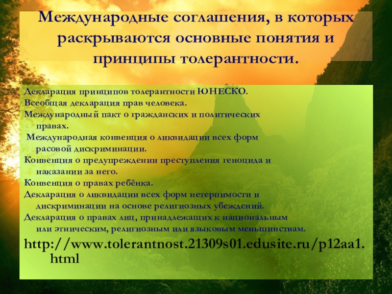 Слайд 13Международные соглашения, в которых раскрываются основные понятия и принципы толерантности.