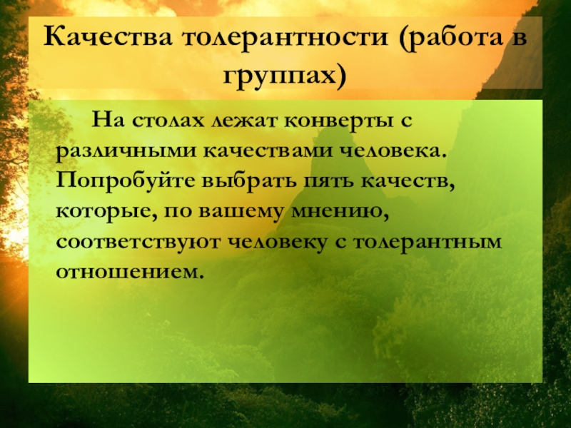 человека. Попробуйте выбрать пять качеств, которые, по вашему мнению, соответствуют человеку с толерантным отношением.