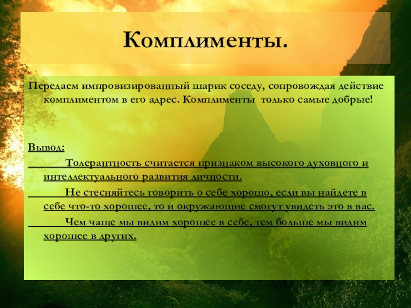 Передаем импровизированный шарик соседу, сопровождая действие комплиментом в его адрес. Комплименты