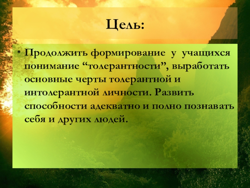 Продолжить формирование у учащихся понимание “толерантности”, выработать основные черты толерантной